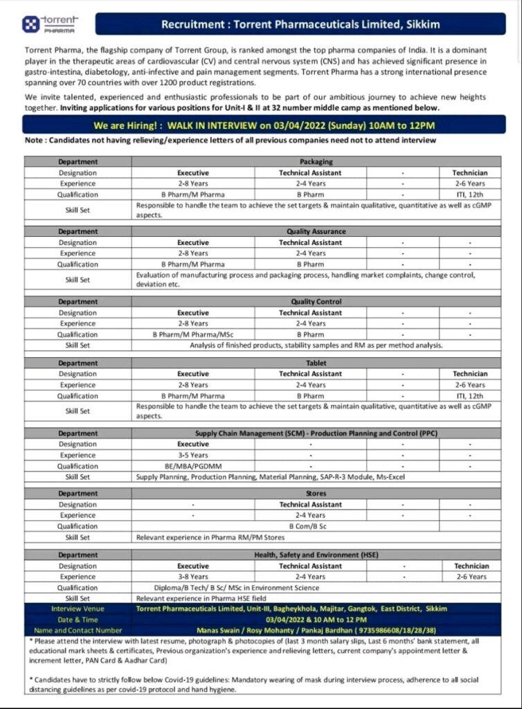 Torrent Pharma Walk In Interview for Production/Packing QA/ QC/ PPC/ Stores/ HSE department on 03/04/2022 @Sikkim