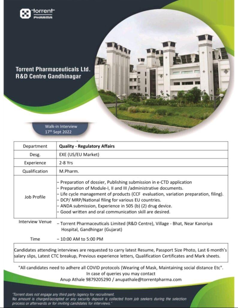 Torrent Pharma Walk-in Interview for Quality- Regulatory Affairs department on 17th Sept 2022