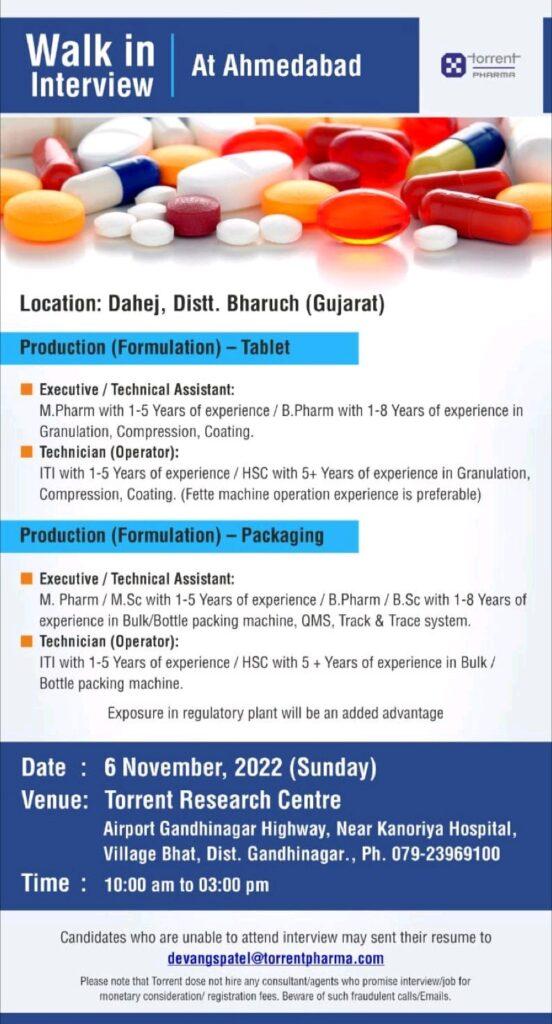 Torrent Pharma Walk in Interview for Technician (Operator), Executive in Production (Formulation) – Tablet & Packaging department on 6th November, 2022 (Sunday)