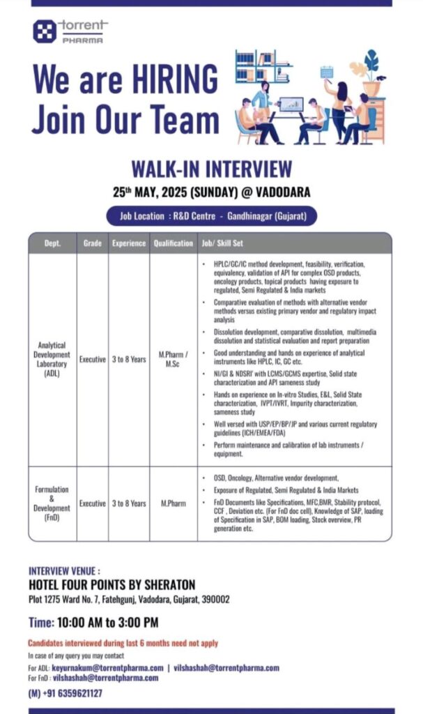 Torrent Pharma, a leader in the pharmaceutical industry, is hosting a walk-in interview event for talented professionals to join its Research & Development (R&D) Centre in Gandhinagar, Gujarat.