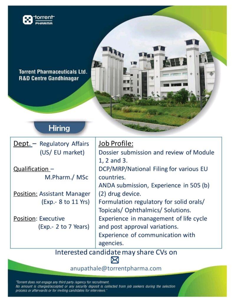 Torrent Pharmaceuticals job vacancy for Regulatory Affairs (US/EU market) Apply Now