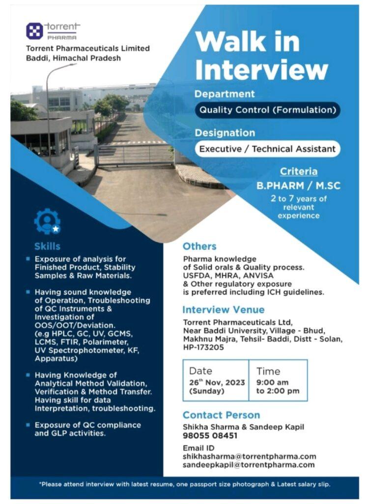 Torrent Pharmaceuticals Limited Baddi, Himachal Pradesh walk in interview on 26th Nov, 2023 (Sunday)