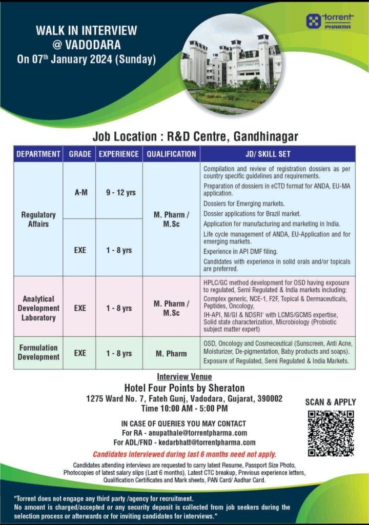 Torrent Pharmaceuticals Limited (R&D Centre) walk in interview for Regulatory Affairs, Analytical Development Laboratory, Formulation Development On 07th January 2024 (Sunday)