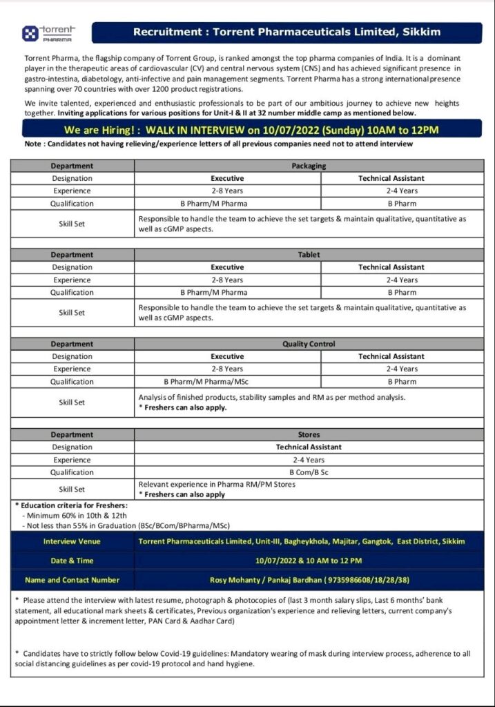 Torrent Pharmaceuticals Limited, Sikkim Walk In Interview for Packaging, Tablet, Quality Control & Stores on 10th July 2022