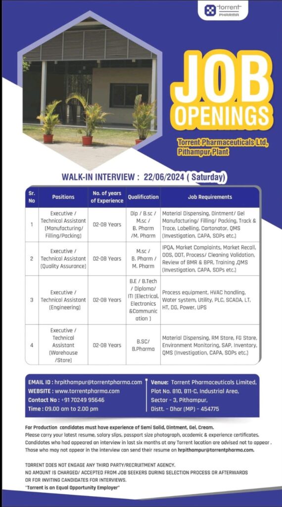 Torrent Pharmaceuticals Ltd, Pithampur Plant walk in interview on 22/06/2024 (Saturday)