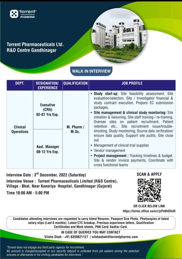 Torrent Pharmaceuticals Ltd. R&D Centre Gandhinagar Walk in Interview for Clinical Operations on 3rd December, 2022