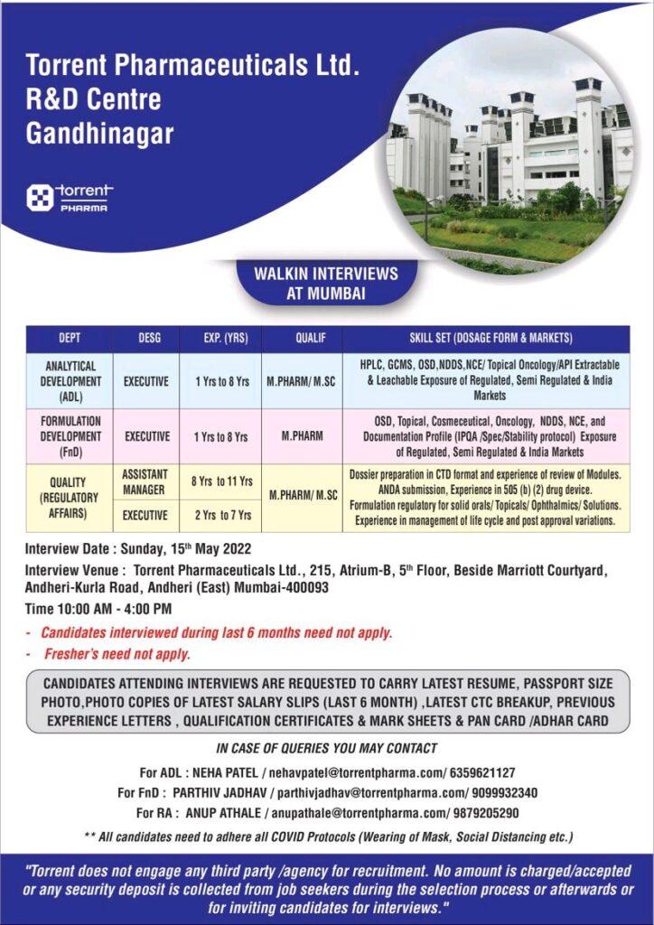 Torrent Pharmaceuticals Ltd. R&D Walk In Interview at Mumbai on Sunday, 15th May 2022