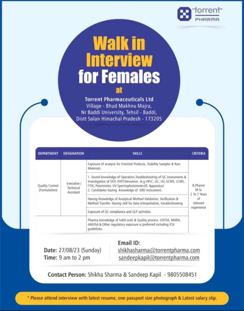 Torrent Pharmaceuticals Ltd Village Bhud Makhnu Majra, Nr Baddi University, Tehsil – Baddi, Distt Solan Himachal Pradesh- 173205