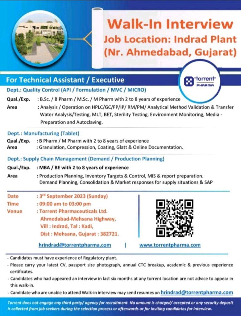 •Candidate who are unable to attend Walk-in interview may send resumes on hrindrad@torrentpharma.com