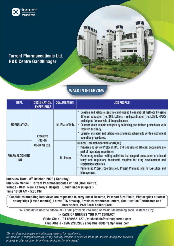 Torrent Pharmaceuticals Ltd Walk In Interview for Bioanalytical & Pharmacokinetic Unit on 8th October, 2022