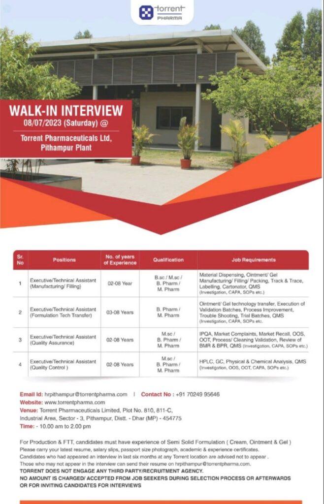 Torrent Pharmaceuticals – Walk in drive for Manufacturing/ Filling/ Formulation Tech Trarater / Quality Assurance/ Quality Control @ Pithampur Plant on 08/07/2023