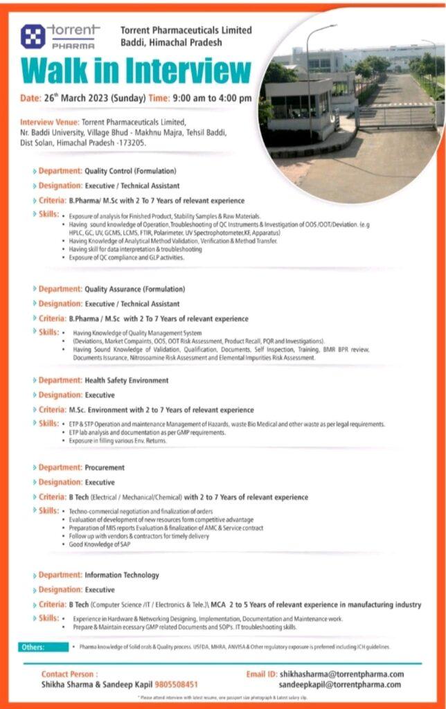 Interview Venue: Torrent Pharmaceuticals Limited, Nr. Baddi University, Village Bhud- Makhnu Majra, Tehsil Baddi, Dist Solan, Himachal Pradesh -173205.