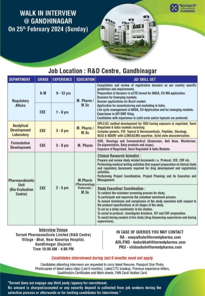 Torrent Pharmaceuticals walk in interview for RA, ADL, Formulation Development, Pharmacokinetic Unit on 25th February 2024 (Sunday)