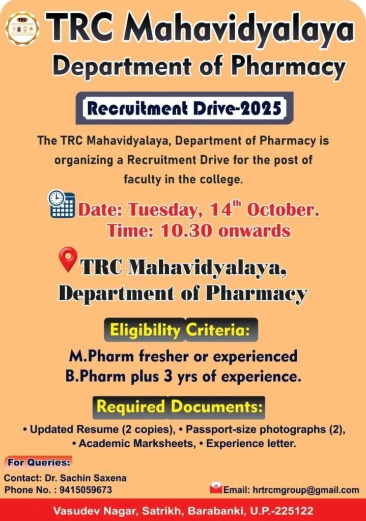 The TRC Mahavidyalaya, Department of Pharmacy is inviting applications for its Recruitment Drive 2025, offering an excellent opportunity for aspiring pharmacy educators to join their esteemed institution. The recruitment aims to fill faculty positions within the department, contributing to the academic and professional growth of students pursuing pharmaceutical education.