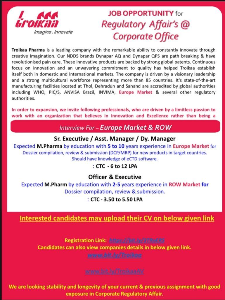 Troikaa Pharma- Job vacancy for Regulatory Affair @ Corporate Office