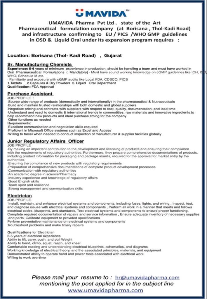 UMAVIDA Pharma Pvt Ltd Sr. Manufacturing Chemists (FDA Approval), Purchase Assistant, Junior Regulatory Affairs Officer & Electrician