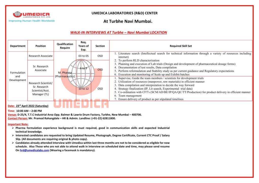 UMEDICA LABORATORIES (R&D) CENTER Walk In Interview @Turbhe Navi Mumbai on 23 April 2022