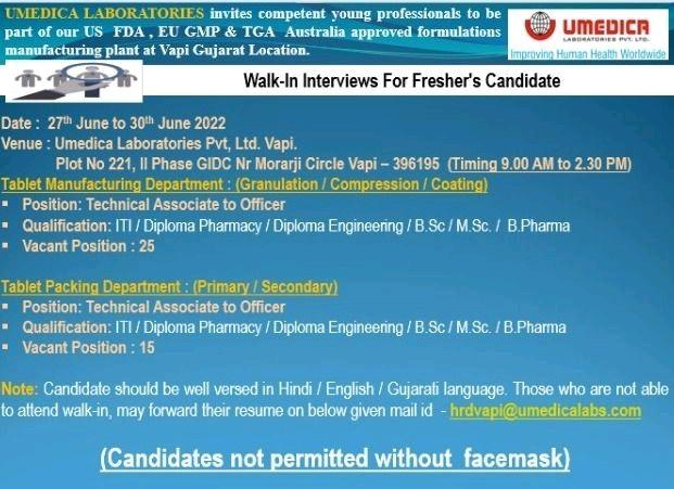 Umedica Laboratories Walk In Interview for FRESHERS ITI / Diploma Pharmacy/Diploma Engineering/B.Sc/M.Sc./B.Pharma on 27th June to 30th June 2022 – Vacant Position 40