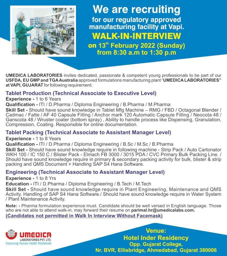 Umedica Laboratories, Walk In Interview for Tablet Manufacturing, Packing & Engineering department on 13th Feb’2022 at Ahmedabad