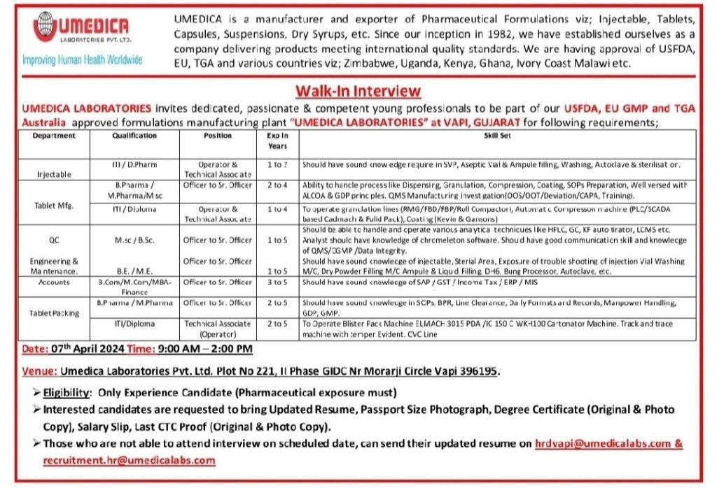 Umedica Laboratories Walk-In Interview for Tablet Mfg./ Injectable/ QC/ Tablet Packing & Accounts on 07th April 2024