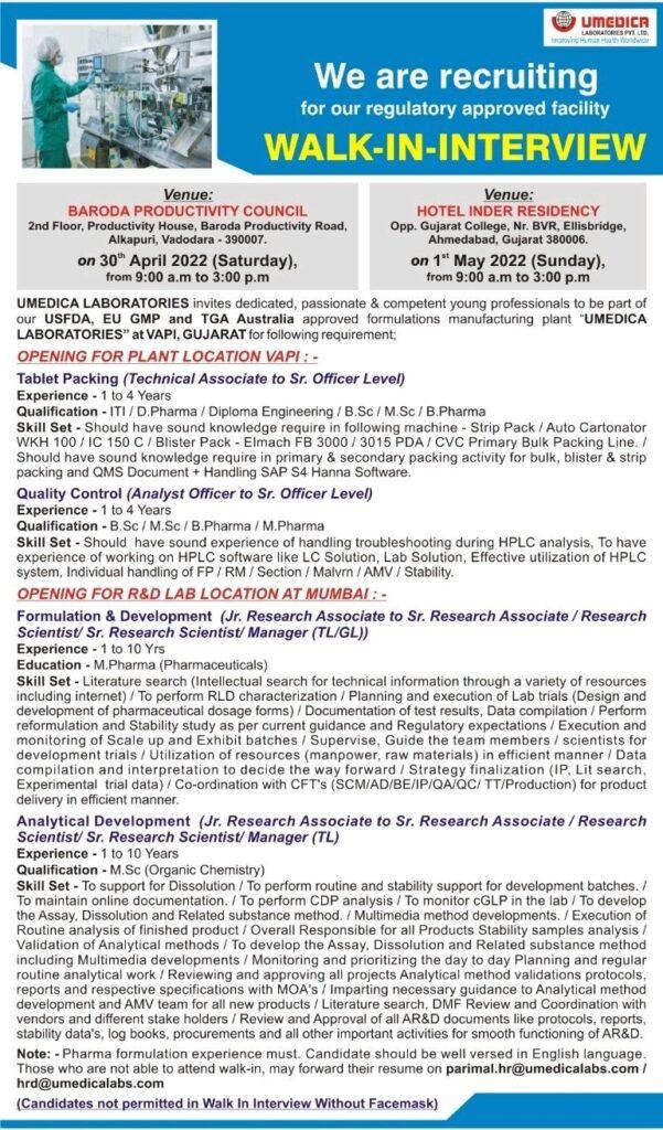 Note: – Pharma formulation experience must. Candidate should be well versed in English language. Those who are not able to attend walk-in, may forward their resume on parimal.hr@umedicalabs.com/