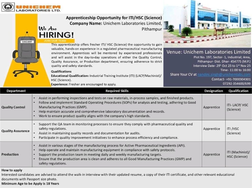 Unichem Laboratories Ltd. invites fresh and enthusiastic candidates to join as Apprentices in Quality Control (QC), Quality Assurance (QA), and Production departments. This is an excellent chance to gain hands-on industrial experience in a regulated pharmaceutical manufacturing environment.