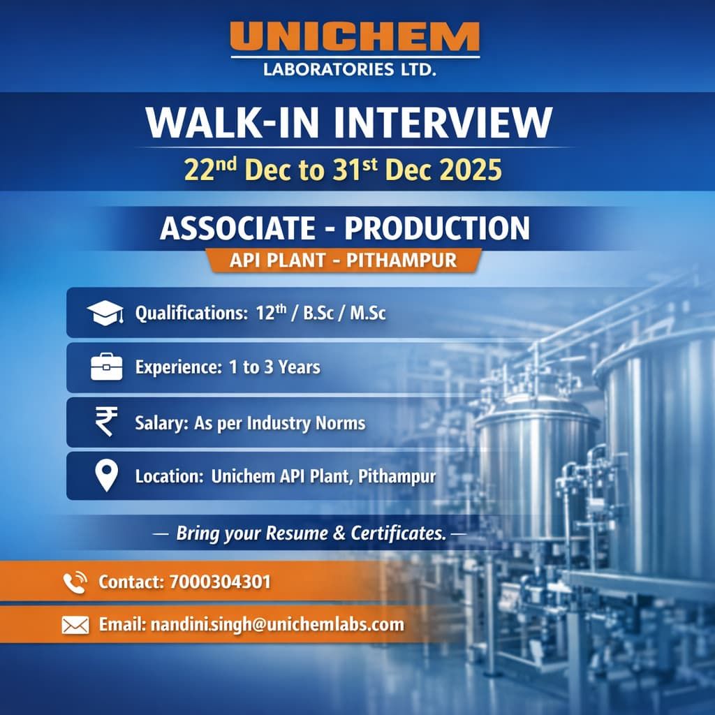 Unichem Laboratories Ltd. has announced an extensive walk-in interview drive for the position of Associate – Production. This is a significant opportunity for professionals in the pharmaceutical sector looking to advance their careers at an API (Active Pharmaceutical Ingredient) manufacturing facility.