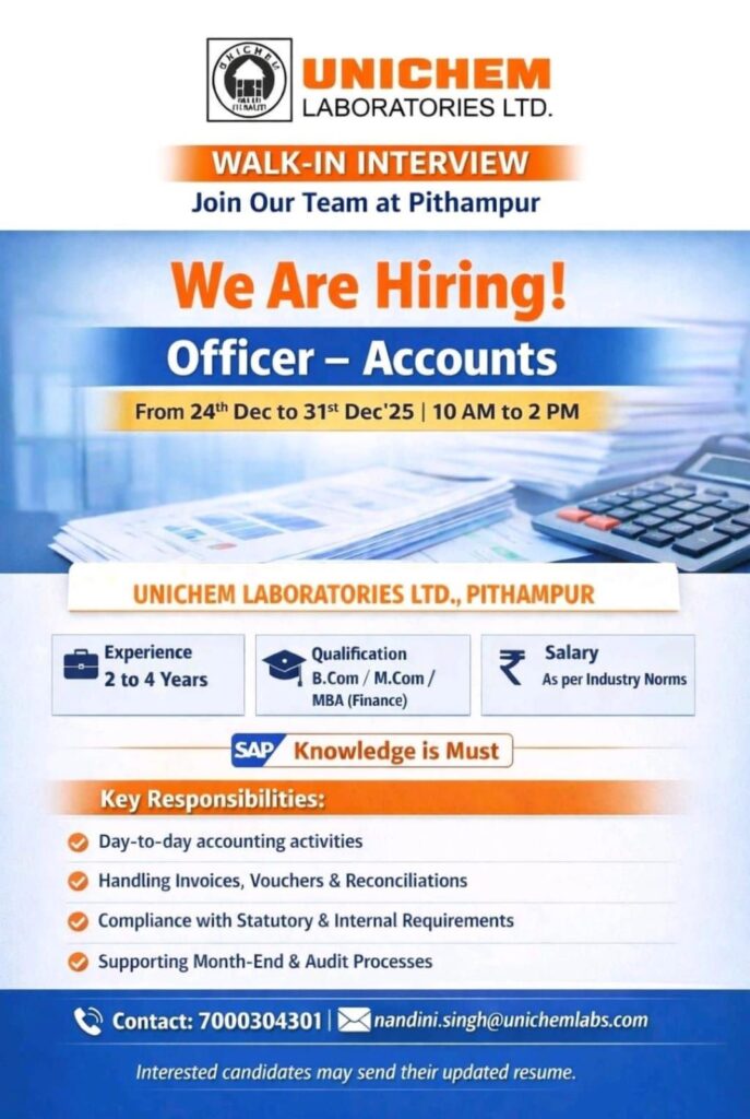 Unichem Laboratories Ltd., a renowned name in the pharmaceutical industry, has announced a walk-in interview drive for the position of Officer – Accounts at their Pithampur location. This is an excellent opportunity for finance professionals looking to advance their careers within a structured and reputable corporate environment.