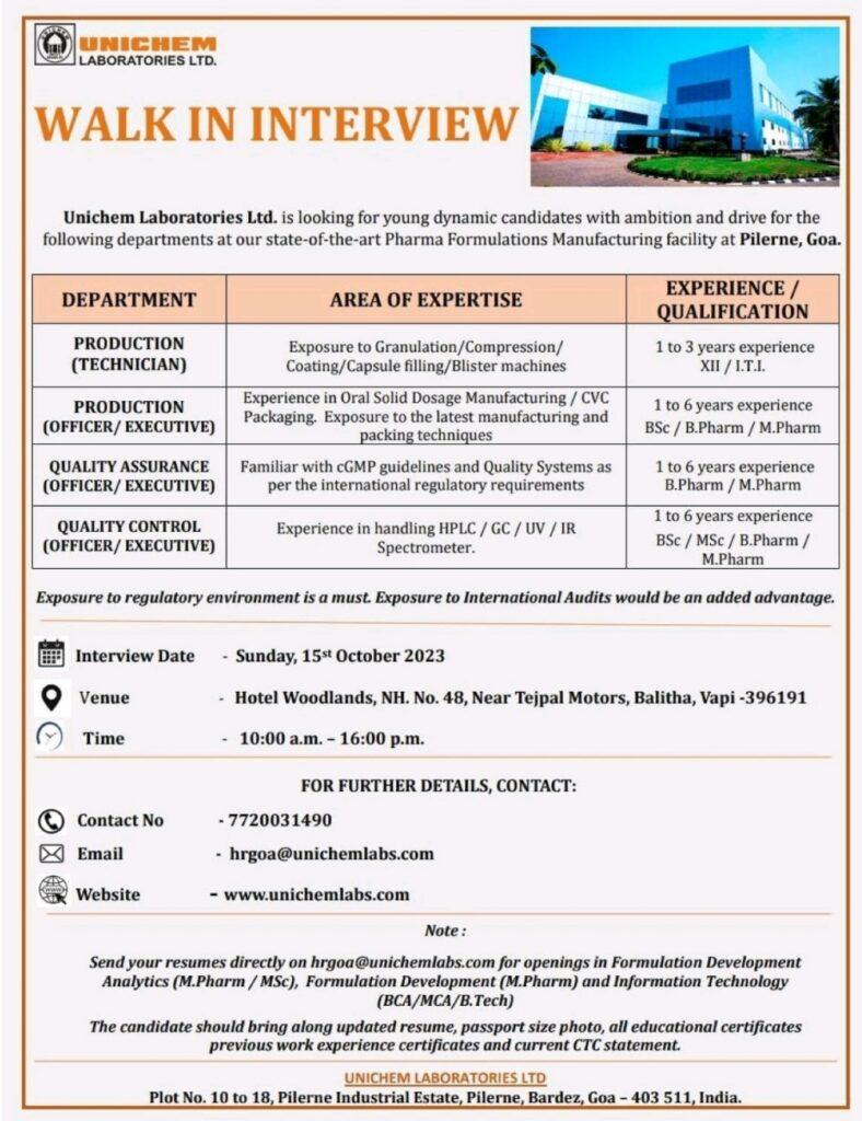 Unichem Laboratories Ltd. is looking for young dynamic candidates with ambition and drive for the following departments at our state-of-the-art Pharma Formulations Manufacturing facility at Pilerne, Goa.