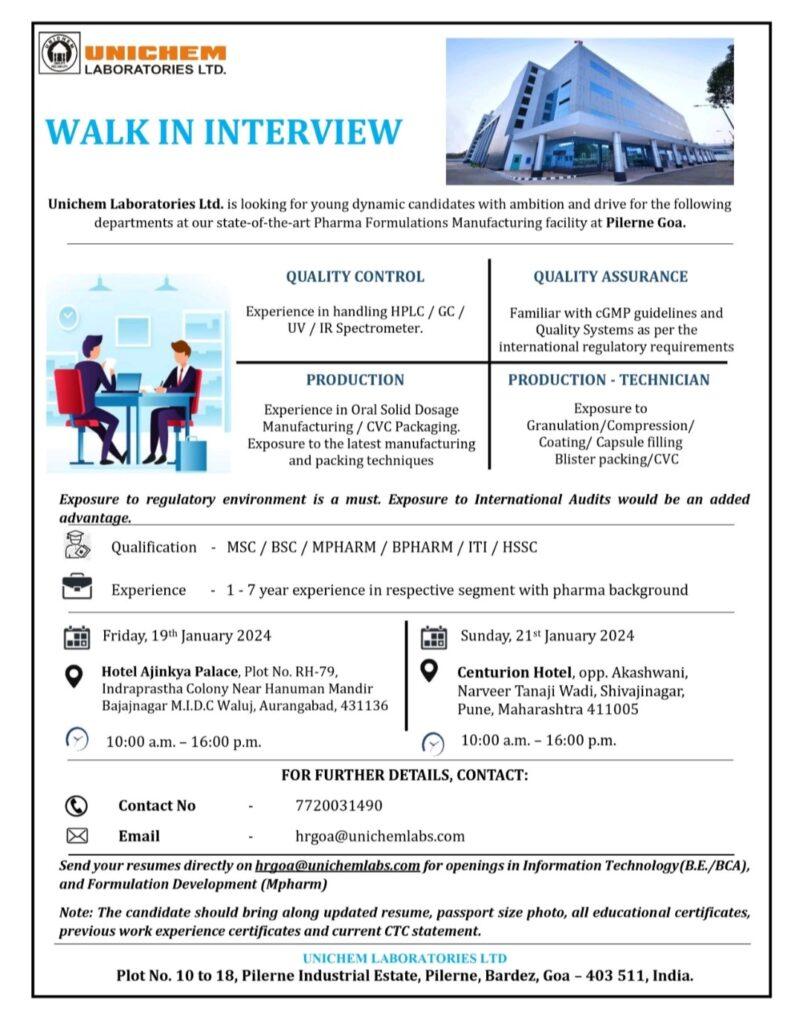 Unichem Laboratories walk in interview for QA, QC, Production on 19th & 21st January 2024