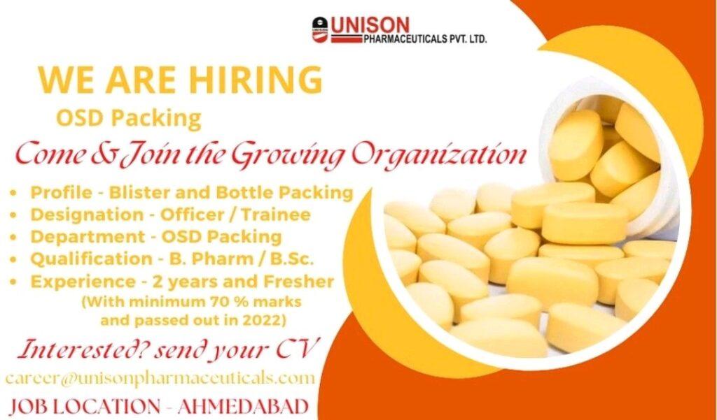 UNISON PHARMA Hiring Freshers & experience for Officer/ Trainee- OSD Packing department