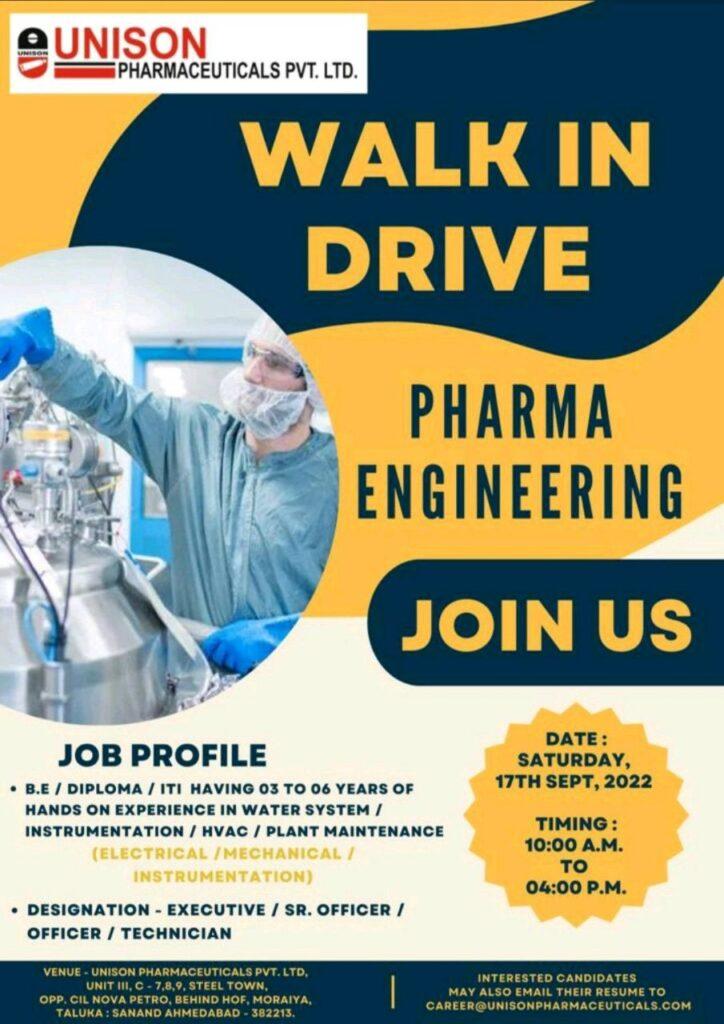 UNISON PHARMA Walk In Interview for Pharma Engineering department