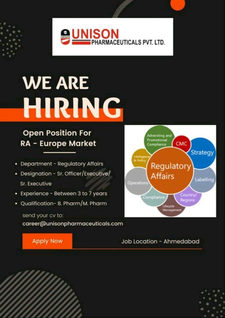 UNISON PHARMACEUTICALS hiring for Regulatory Affairs- Europe Market