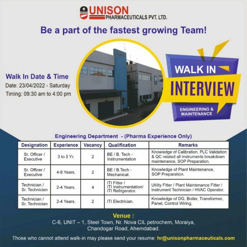 Unison Pharmaceuticals Limited, Walk-In Interviews for Engineering Department on 23rd April 2022