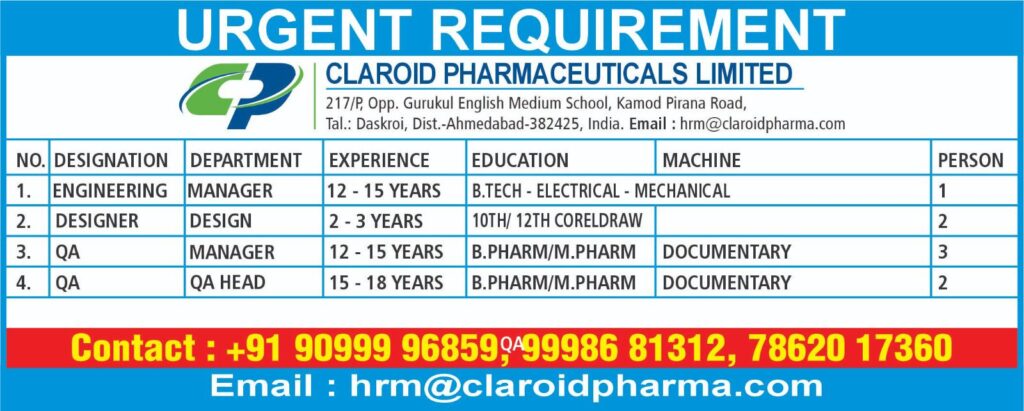 Claroid Pharmaceuticals Limited has an urgent requirement for experienced professionals to join their team. They are seeking candidates for key roles in Engineering, Design, and Quality Assurance (QA).