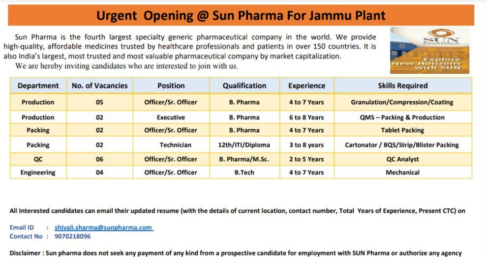 Urgent Opening @ Sun Pharma For Jammu Plant