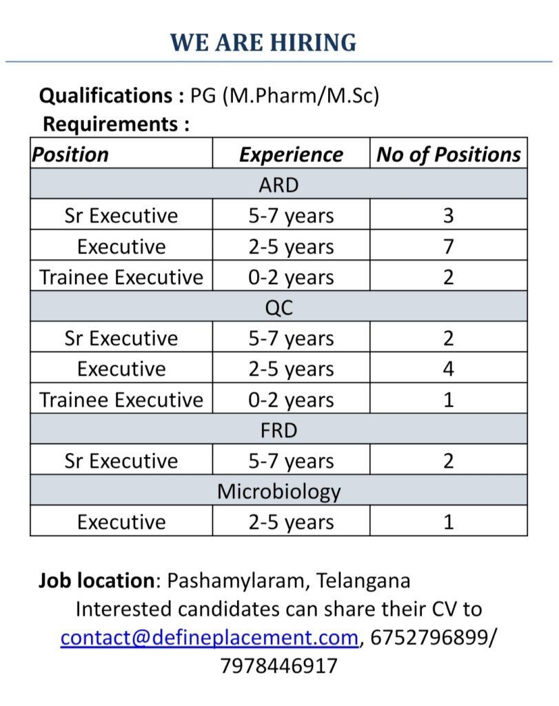 Urgent opening for ARD, QC, FRD, Microbiology department at Pashamylaram, Telangana