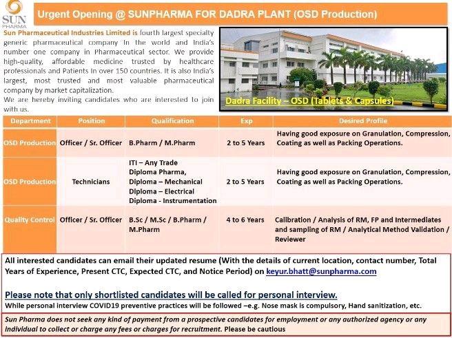 Urgent Opening @ SUN PHARMA FOR DADRA PLANT, OSD Production & QC department