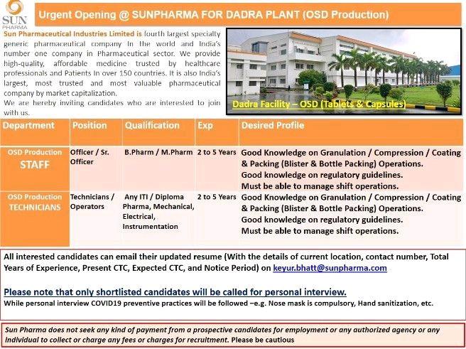 Urgent Opening @ SUNPHARMA FOR DADRA PLANT (OSD Production)