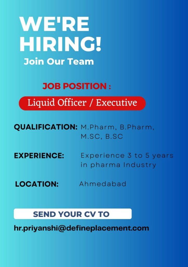 Urgent Requirement for Officer/ Executive- Liquid Manufacturing department @ Ahmedabad