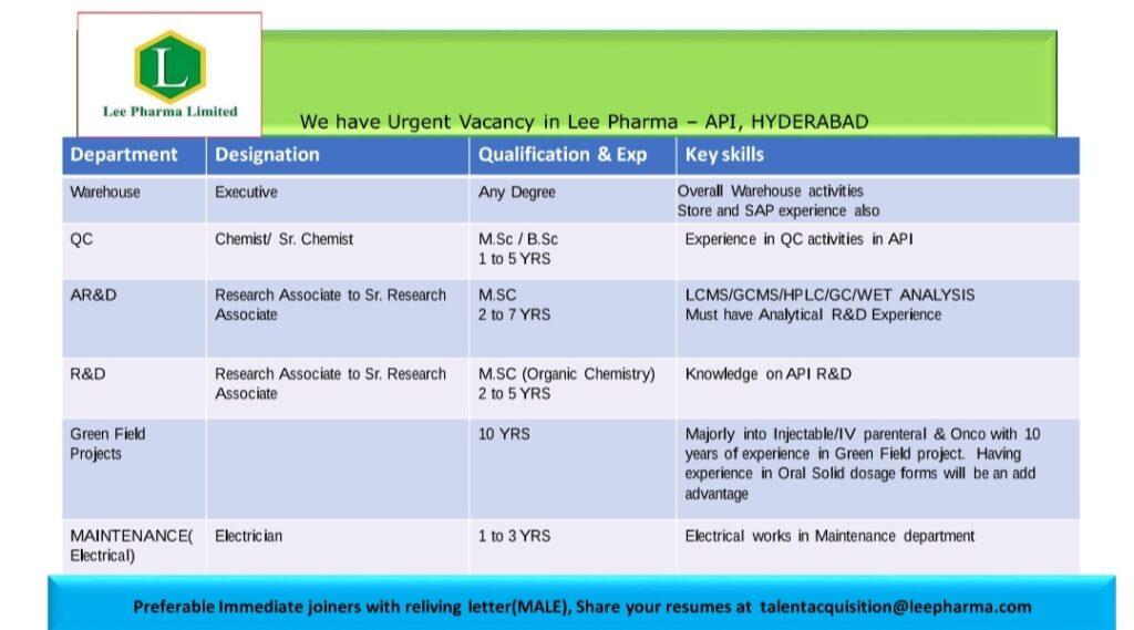 We have Urgent Vacancy in Lee Pharma – API, HYDERABAD