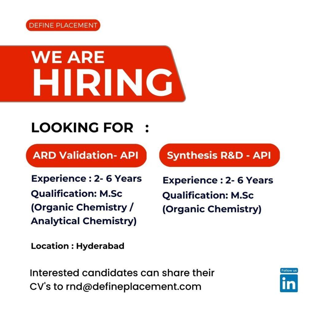Urgently hiring for ARD Validation- API, Synthesis R&D- API at Hyderabad