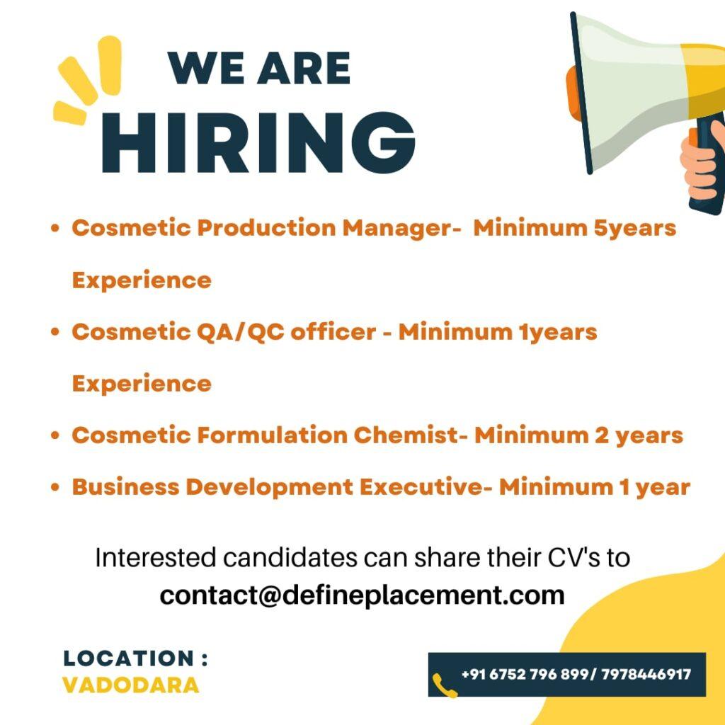 Urgently hiring for Cosmetic Production Manager/ Chemist for formulations/ Cosmetic QA/QC officer/ Business Development Executive at Vadodara