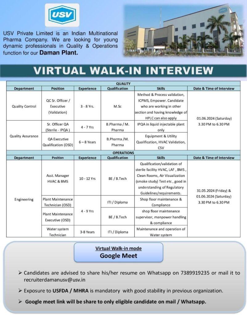 USV Private Limited Virtual Walk-in for Quality Control, Quality Assurance, Engineering department