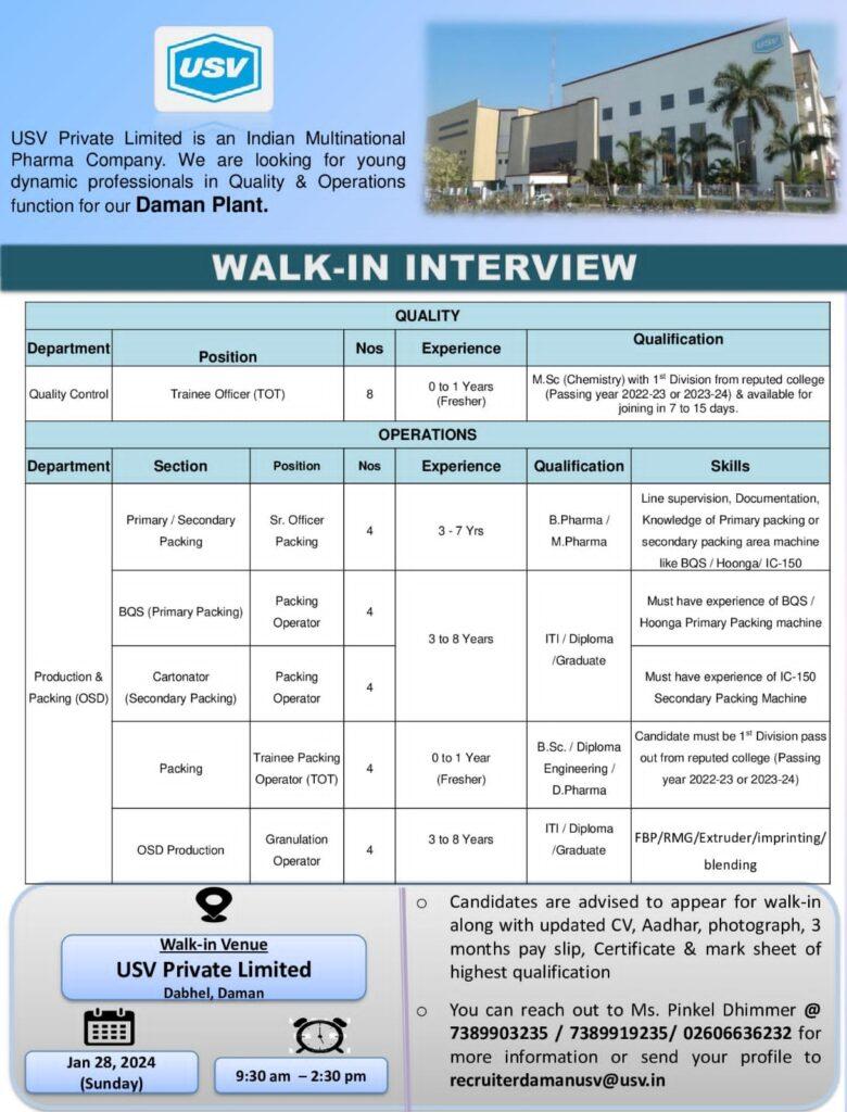 USV Private Limited walk in interview for Quality Control, Production & Packing (OSD) on Jan 28, 2024 (Sunday)