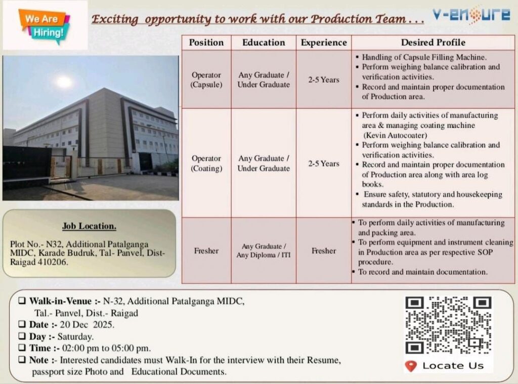 V-Ensure Pharma is inviting talented and motivated individuals to join their Production Team. They are hosting a walk-in interview drive for various roles at their facility in Patalganga MIDC, Raigad. This is an excellent opportunity for both experienced operators and freshers looking to start a career in the pharmaceutical industry.