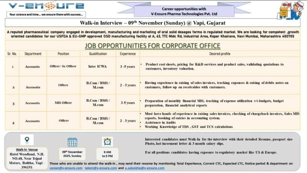 V-Ensure Pharma Technologies Pvt. Ltd., a reputed pharmaceutical company specializing in the development, manufacturing, and marketing of oral solid dosage forms for regulated markets, is conducting a Walk-in Interview for multiple positions in their Corporate Office – Accounts Department.