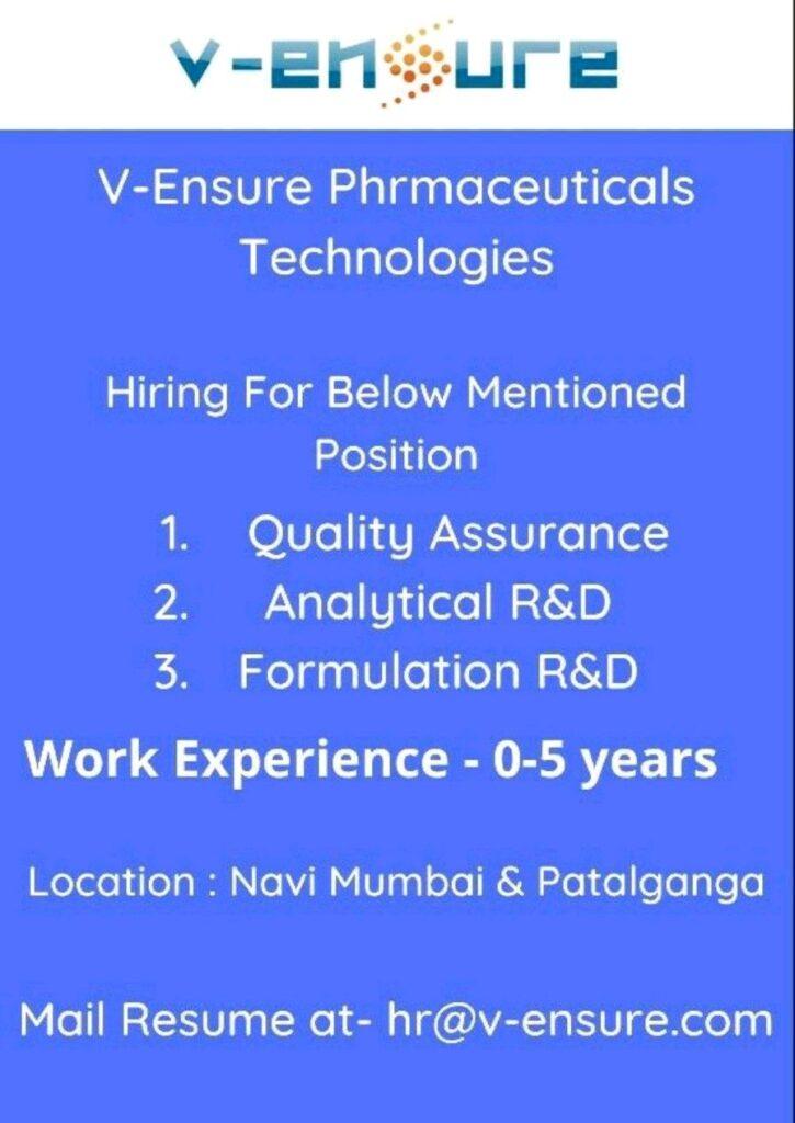 V-Ensure Pharmaceuticals Technologies hiring Freshers & experience for Quality Assurance, Analytical R&D, Formulation R&D department