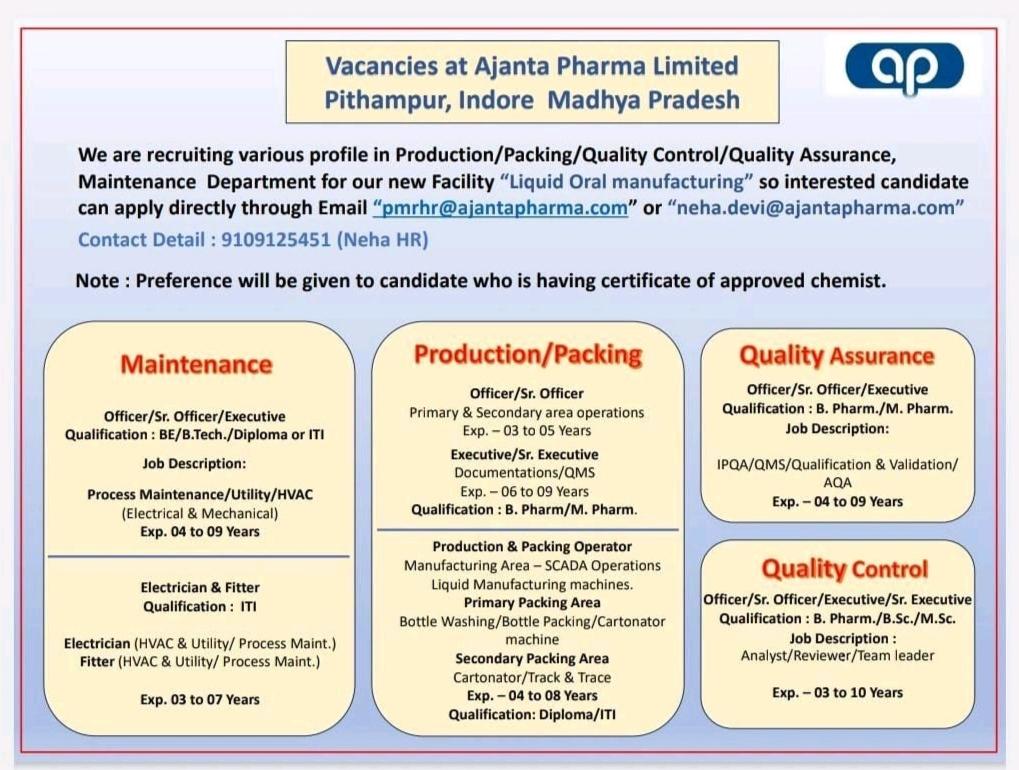We are recruiting various profile in Production/Packing/Quality Control/Quality Assurance, Maintenance Department for our new Facility “Liquid Oral manufacturing” so interested candidate can apply directly through Email “pmrhr@ajantapharma.com” or “neha.devi@ajantapharma.com” Contact Detail : 9109125451 (Neha HR)