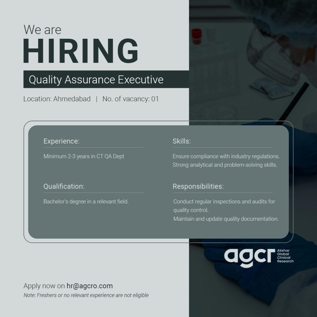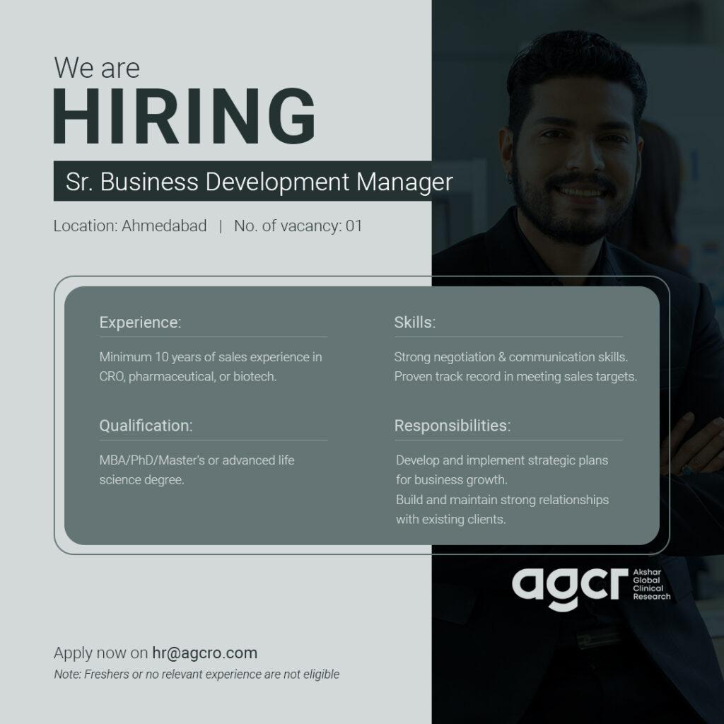 Akshar Global Clinical Research (AGCR) Pvt. Ltd., a prominent player in the clinical research industry. We are currently seeking dynamic and qualified professionals to join our team in Ahmedabad for the positions of Sr. Business Development Manager and Quality Assurance Executive for Contract Research Organization.